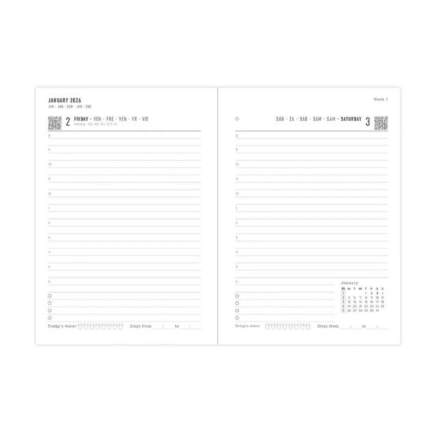 Make a difference with this eco-friendly A6 diary. Featuring sustainable details, such as recycled paper, vegan glue and covers made with recycled polyester from PET bottles. Day to a page diary layout with appointment times. Multilanguage: English, French, German, Italian, Dutch, and Spanish.
