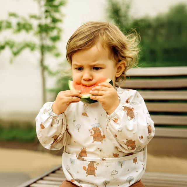 Quick clean ups after mealtimes means more time for play! Our delicious new Wipe Clean collection of long sleeved bibs means you can simply wipe the coated front section of the bib down after every meal and wash it as necessary. Soft nylon sleeves protect clothing while eating or throwing food. Clever food catching pocket makes life easier for Mum and double pop snap closure allows you to pop the bib on in a flash. The sweet design cottons are coated with baby safe PU which is easy wash and tumble dry safe on low.
