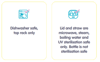 - Materials: Bottle – Tritan™; Straw top – silicone; Lid and straw – PP; Bumper and handle – TPE